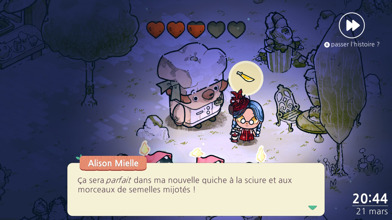 Le tout petit problème que je trouve à Cozy Grove se cache dans les dialogues prétextes. Vous pouvez à l’occasion tailler le bout de gras avec les fantômes, mais vous ferez rapidement le tour. Les ours se partagent trois ou quatre propos, sur le ciel, le scrapbooking ou le chômage, qu’ils ressassent tous de la même manière. L’idée est effectivement chouette, mais n’est pas suffisamment aboutie. Par ailleurs, les dialogues reliés à certaines quêtes finissent eux aussi par se répéter.