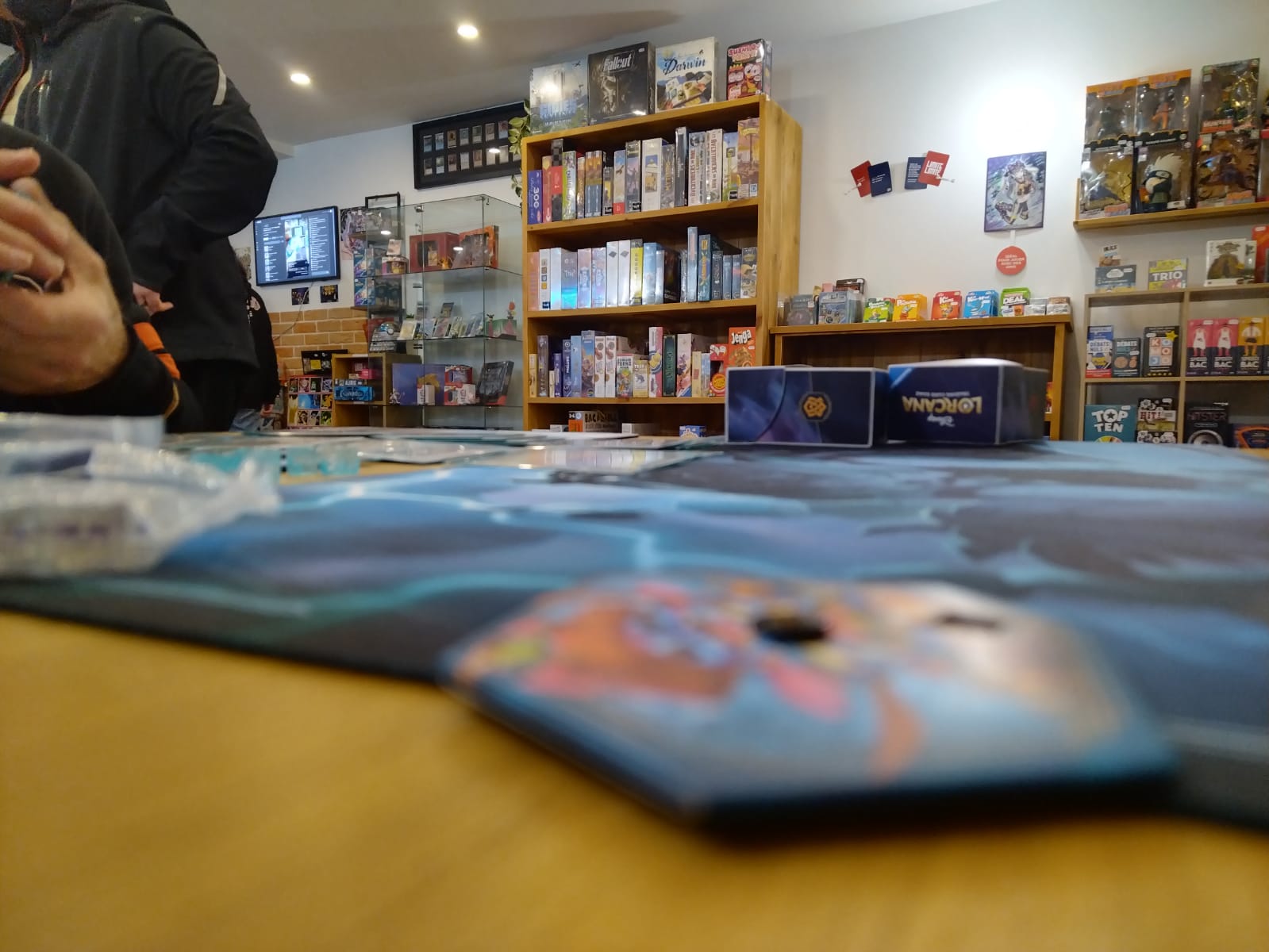 Précisons que je n’ai pas joué à Raiponce pendant six mois… Le potentiel d’interactions était juste réduit à la bibliothèque et à la librairie. Mais c’est justement à côté de cette librairie (et d’une toiletteuse, j’ai le souci du détail inutile) que se trouve la vitrine de Crows Arena. A l’intérieur, trois tables accueillent les joueurs de Magic, de Lorcana ou encore de Pokémon et de Yu-Gi-Oh. Les lieux sont achalandés en cartes, boosters (1), coffrets, matériel de jeu et jeux de société. Le tout est géré par un bonhomme passionné et un peu taquin, Frantz Bourdet-Uygur.