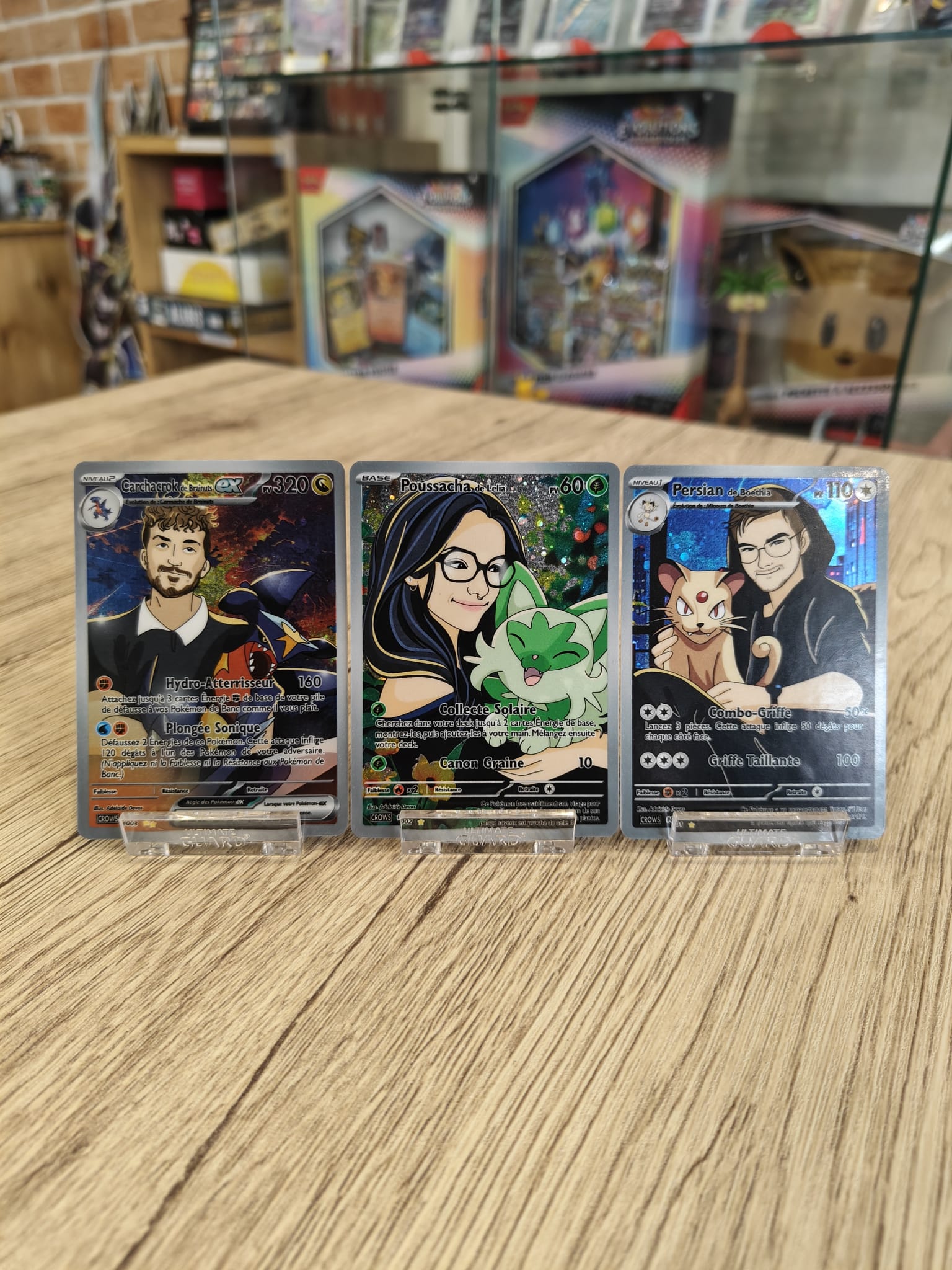 Justement. Pour marquer le coup durablement, l’équipe de Crows Arena s’est associée à l’illustratrice Adélaïde Devos et à Karedas TCG pour proposer trois cartes Pokémon à l’effigie des figures centrales de la boutique. Ils y sont chacun représentés avec leur Pokémon de cœur : Boethia avec Persian, Lelia avec Poussa et Brainuts avec Carchacroc. Si elles n’étaient pas disponibles à la vente, six des neufs exemplaires imprimés ont été remportés dans l’après-midi par certains participants.
